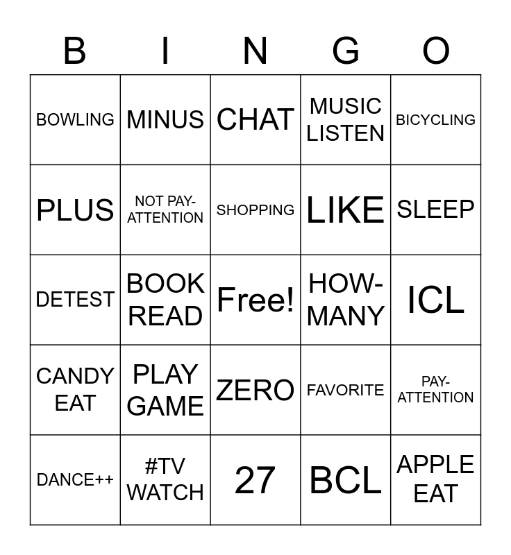 This bingo card has a free space and 24 words: PLAY GAME, #TV WATCH, SHOPPING, DANCE++, BICYCLING, BOWLING, PLUS, MINUS, HOW-MANY, ZERO, LIKE, DETEST, FAVORITE, PAY-ATTENTION, NOT PAY-ATTENTION, BCL, ICL, CHAT, SLEEP, BOOK READ, APPLE EAT, CANDY EAT, MUSIC LISTEN and 27.