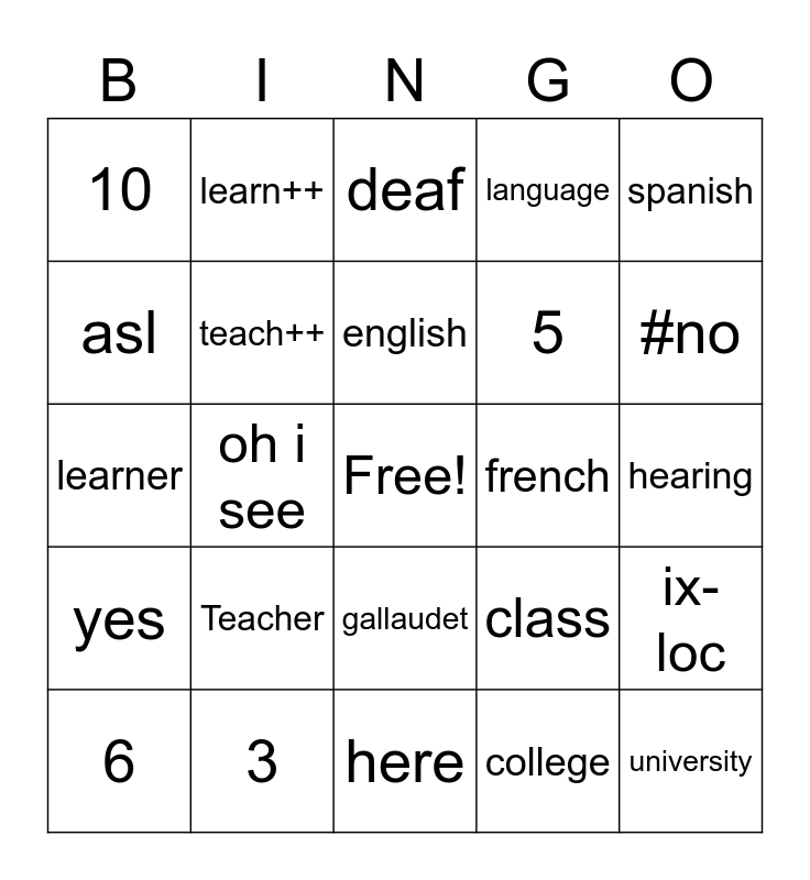 This bingo card has a free space and 24 words: Teacher, 3, english, 6, spanish, 10, asl, learn++, french, gallaudet, 5, learner, class, ix-loc, teach++, college, hearing, deaf, #no, oh i see, university, yes, language and here.