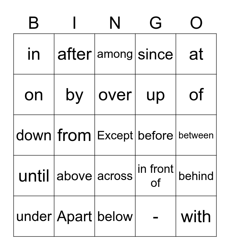 This bingo card has 25 words: above, below, over, under, at, in, on, after, before, across, up, down, in front of, behind, by, with, between, among, of, from, Except, Apart, until, since and -.