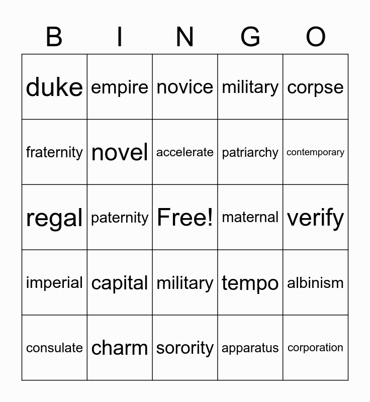 This bingo card has a free space and 24 words: capital, charm, accelerate, consulate, corpse, duke, fraternity, empire, maternal, military, patriarchy, regal, tempo, albinism, novel, apparatus, verify, novice, contemporary, paternity, corporation, imperial, military and sorority.
