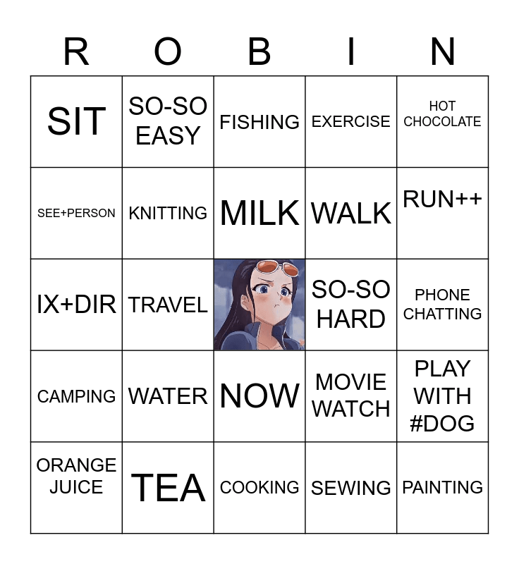 This bingo card has a free space and 24 words: WATER, TEA, MILK, ORANGE JUICE, HOT CHOCOLATE, SIT, SEE+PERSON, SO-SO EASY, SO-SO HARD, NOW, WALK, IX+DIR, MOVIE WATCH, PLAY WITH #DOG, KNITTING, SEWING, PHONE CHATTING, FISHING, RUN++, TRAVEL, PAINTING, CAMPING, EXERCISE and COOKING.