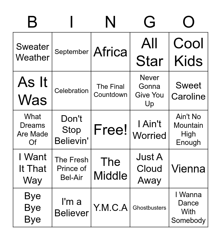 This bingo card has a free space and 24 words: The Fresh Prince of Bel-Air, I'm a Believer, The Final Countdown, Bye Bye Bye, Cool Kids, Sweater Weather, As It Was, September, I Ain't Worried, The Middle, Never Gonna Give You Up, What Dreams Are Made Of, Just A Cloud Away, Vienna, Celebration, Ghostbusters, Ain't No Mountain High Enough, Africa, Sweet Caroline, Don't Stop Believin', I Wanna Dance With Somebody, I Want It That Way, All Star and Y.M.C.A.
