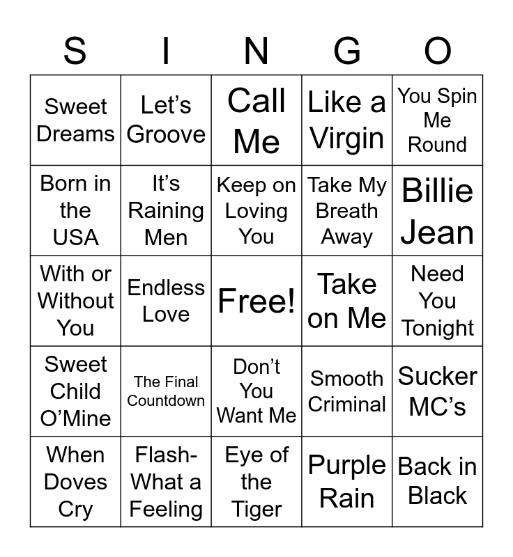 This bingo card has a free space and 50 words: Super Freak, Back in Black, Money for Nothing, Eye of the Tiger, The Final Countdown, Sharped Dressed Man, Let’s Groove, Ace of Spades, Born in the USA, Like a Prayer, It’s Raining Men, Like a Virgin, Sucker MC’s, Smooth Criminal, Busta Move, Gypsy, Keep on Loving You, Take on Me, Here I Go Again, You Spin Me Round, Endless Love, Purple Rain, Sweet Dreams, Take My Breath Away, I’m Still Standing, All Night Long, Billie Jean, Burning Down the House, Call Me, Don’t You Want Me, Blister in the Sun, Don’t Stop Believing, Every Breath You Take, Fight the Power, Flash-What a Feeling, Hungry Like the Wolf, I Ran, I Wanna Dance with Somebody, Just Like Heaven, Need You Tonight, Our Lips are Sealed, Pour Some Sugar on Me, Total Eclipse of the Heart, Walk this Way, When Doves Cry, With or Without You, I’m Coming Out, Tainted Love, Sweet Child O’Mine and Never Gonna Give You Up.