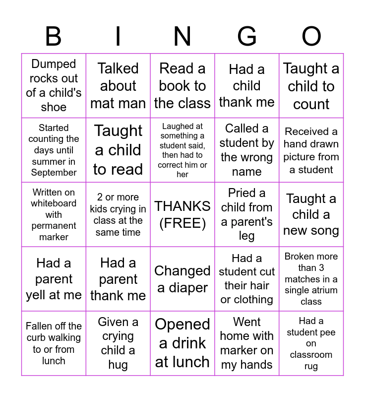 This bingo card has a free space and 30 words: Given a crying child a hug, Tied wet shoelaces, 2 or more kids crying in class at the same time, Taken a mental health day, Dumped rocks out of a child's shoe, Read a book to the class, Taught a child to read, Changed a diaper, Pried a child from a parent's leg, Opened a drink at lunch, Taught a child a new song, Had a student pee on classroom rug, Went home with marker on my hands, Lost a glue stick lid, Received a hand drawn picture from a student, Received a hug from a student, Had a student cut their hair or clothing, Had a parent yell at me, Had a parent thank me, Taught a child to count, Written on whiteboard with permanent marker, Said, "Because I said so" to a student, Talked about mat man, Called a student by the wrong name, Started counting the days until summer in September, Had a child thank me, Broken more than 3 matches in a single atrium class, Fallen off the curb walking to or from lunch, Laughed at something a student said, then had to correct him or her and Hidden from a child when out in the "real" world.