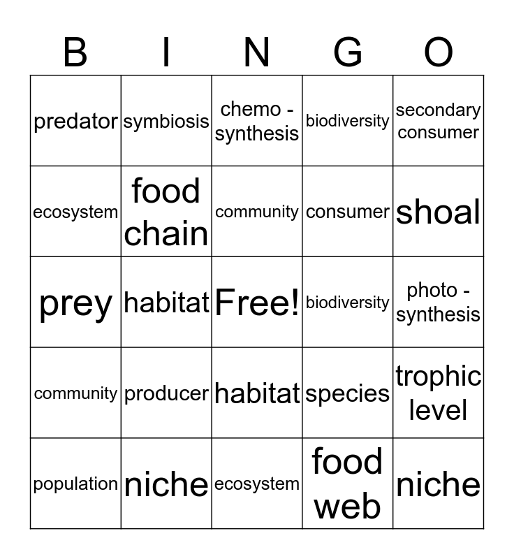 This bingo card has a free space and 24 words: producer, niche, community, population, secondary consumer, predator, ecosystem, symbiosis, biodiversity, habitat, consumer, prey, species, trophic level, food chain, food web, photo - synthesis, chemo - synthesis, shoal, habitat, niche, community, biodiversity and ecosystem.
