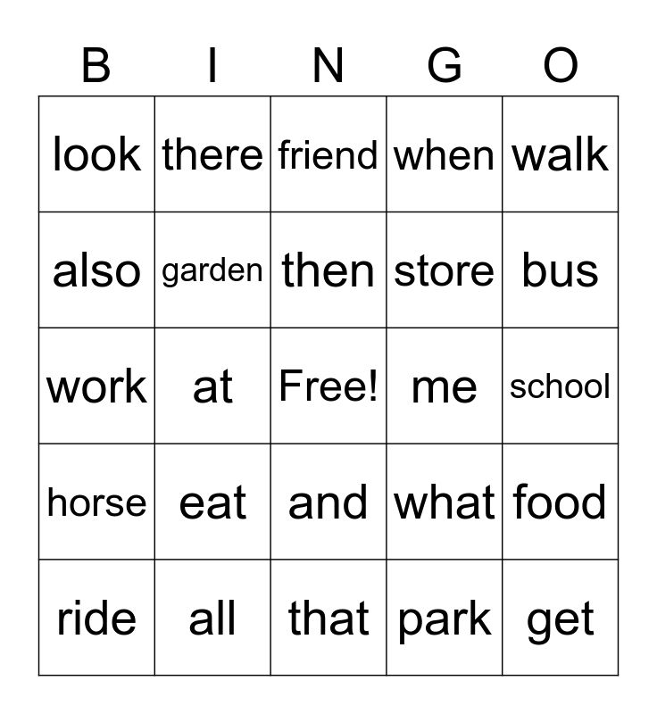 This bingo card has a free space and 37 words: pick, from, our, garden, food, eat, then, around, walk, of, at, when, get, school, also, horse, for, friend, and, me, look, bus, ride, that, much, park, there, play, we, with, help, all, work, have, what, store and to.