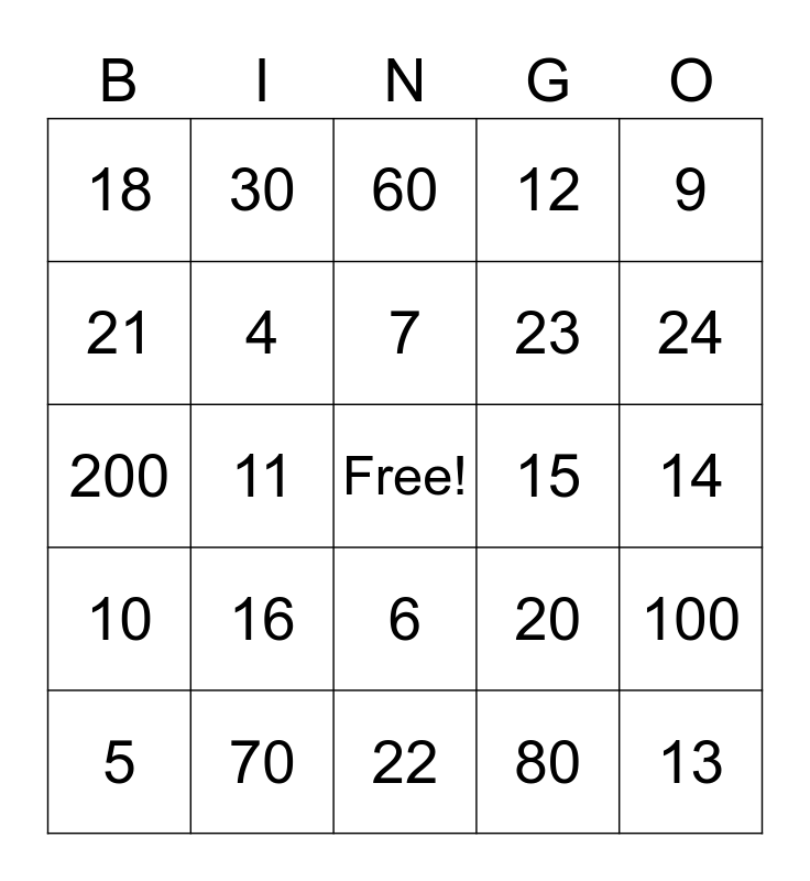 This bingo card has a free space and 39 words: 1, 2, 3, 4, 5, 6, 7, 8, 9, 10, 11, 12, 13, 14, 15, 16, 17, 18, 19, 20, 21, 22, 23, 24, 25, 26, 27, 28, 29, 30, 40, 50, 60, 70, 80, 90, 100, 200 and 300.