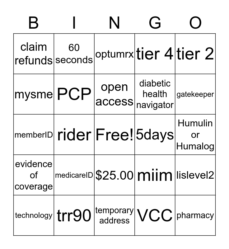 This bingo card has a free space and 24 words: medicareID, trr90, open access, technology, tier 2, claim refunds, mysme, 60 seconds, 5days, $25.00, diabetic health navigator, memberID, miim, lislevel2, PCP, VCC, Humulin or Humalog, optumrx, gatekeeper, rider, pharmacy, evidence of coverage, tier 4 and temporary address.