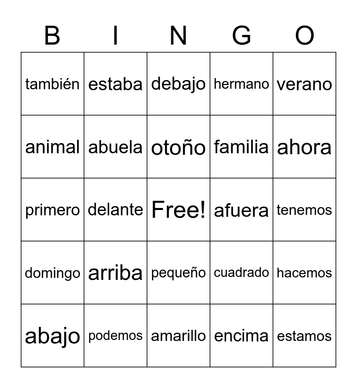 This bingo card has a free space and 24 words: abajo, arriba, otoño, encima, verano, también, estaba, debajo, afuera, tenemos, primero, abuela, cuadrado, hacemos, animal, podemos, amarillo, hermano, ahora, domingo, delante, pequeño, familia and estamos.