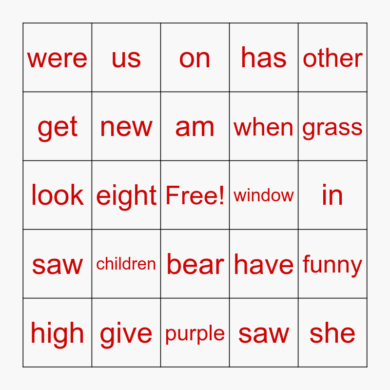 This bingo card has a free space and 24 words: children, give, am, high, other, were, get, us, window, bear, when, look, have, funny, new, saw, in, on, grass, eight, she, saw, has and purple.