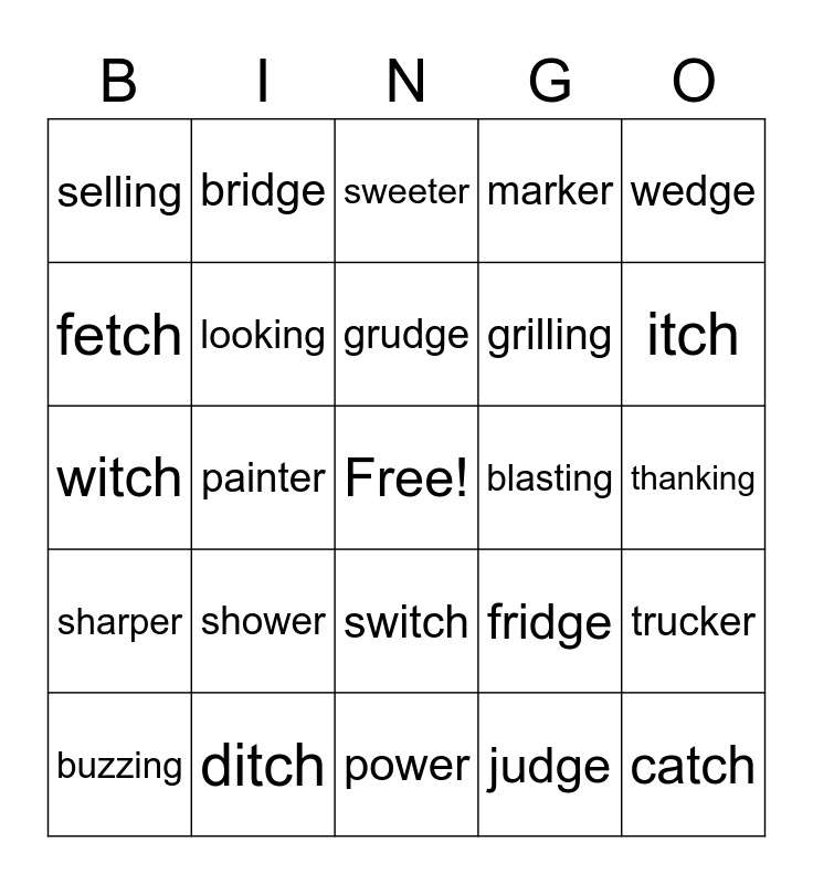This bingo card has a free space and 24 words: shower, ditch, grudge, buzzing, wedge, selling, fetch, bridge, blasting, switch, grilling, witch, fridge, trucker, looking, judge, thanking, sweeter, itch, painter, catch, sharper, marker and power.
