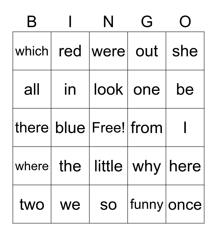 This bingo card has a free space and 24 words: the, we, look, two, she, which, all, red, from, little, one, there, why, here, in, funny, I, were, be, blue, once, where, out and so.