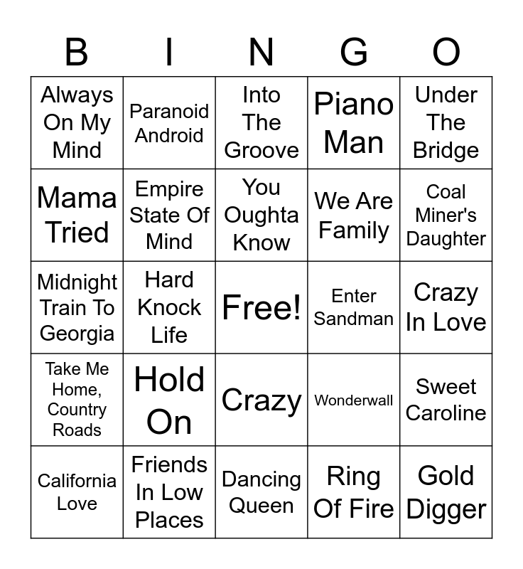 This bingo card has a free space and 28 words: Sweet Caroline, Juicy, We Are Family, Ring Of Fire, Mama Tried, Into The Groove, Paranoid Android, Take Me Home, Country Roads, Enter Sandman, California Love, Midnight Train To Georgia, Piano Man, Friends In Low Places, Dancing Queen, Coal Miner's Daughter, Waterfalls, Hold On, Empire State Of Mind, You Oughta Know, Crazy, Always On My Mind, Nothing Compares 2 U, Gold Digger, Hard Knock Life, Crazy In Love, Wonderwall, Under The Bridge and Gangsta's Paradise.