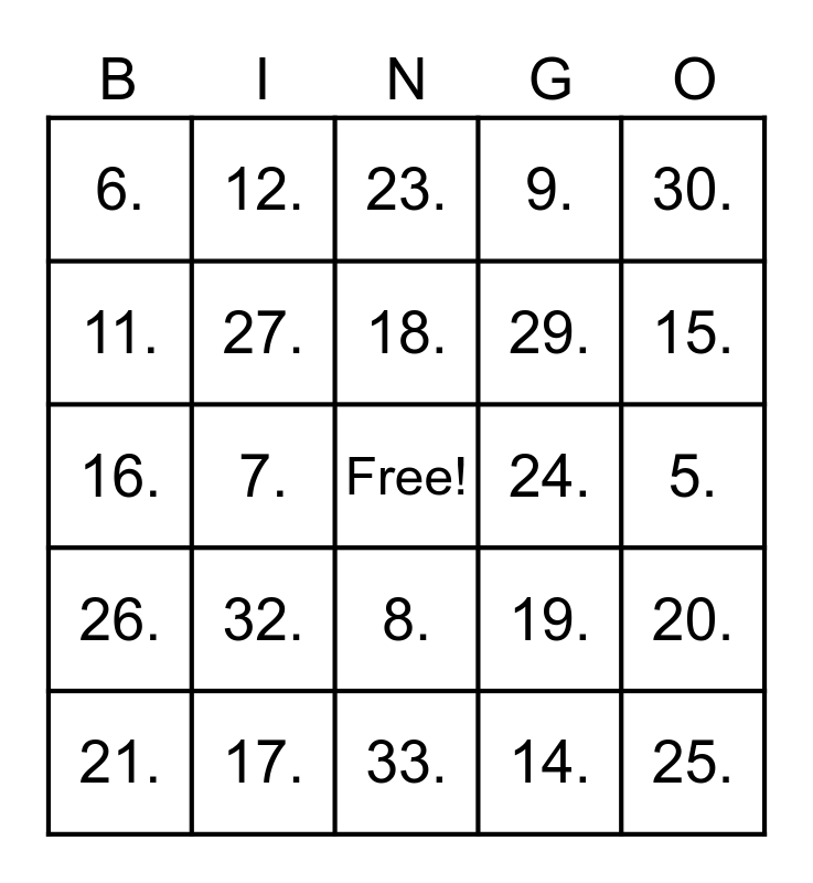 This bingo card has a free space and 34 words: 1., 2., 3., 4., 5., 6., 7., 8., 9., 10., 11., 12., 13., 14., 15., 16., 17., 18., 19., 20., 21., 22., 23., 24., 25., 26., 27., 28., 29., 30., 31., 32., 33. and 34..
