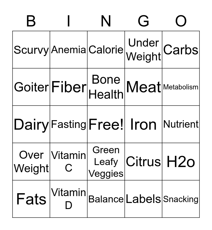 This bingo card has a free space and 24 words: Vitamin C, Vitamin D, Bone Health, Fats, Carbs, Scurvy, Goiter, Anemia, Iron, Green Leafy Veggies, Meat, Dairy, Citrus, H2o, Fiber, Labels, Nutrient, Calorie, Metabolism, Fasting, Snacking, Over Weight, Under Weight and Balance.