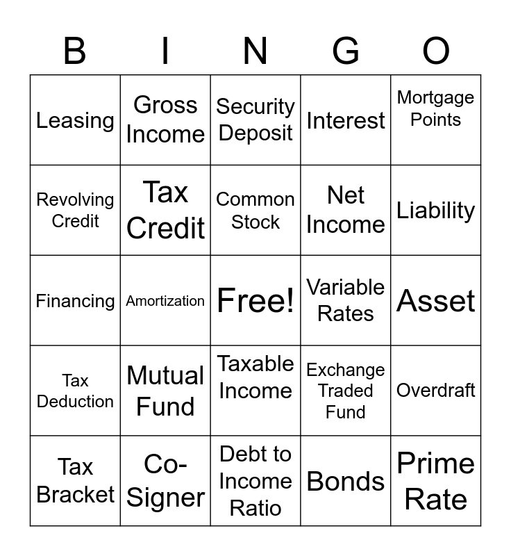 This bingo card has a free space and 24 words: Mutual Fund, Co-Signer, Common Stock, Tax Bracket, Mortgage Points, Leasing, Revolving Credit, Gross Income, Variable Rates, Taxable Income, Net Income, Financing, Exchange Traded Fund, Overdraft, Tax Credit, Bonds, Asset, Security Deposit, Liability, Amortization, Prime Rate, Tax Deduction, Interest and Debt to Income Ratio.