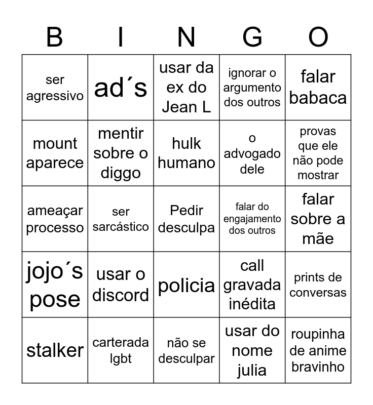 This bingo card has a free space and 24 words: usar o discord, carterada lgbt, hulk humano, stalker, falar babaca, ser agressivo, mount aparece, ad´s, falar do engajamento dos outros, policia, o advogado dele, ameaçar processo, call gravada inédita, prints de conversas, mentir sobre o diggo, usar do nome julia, falar sobre a mãe, usar da ex do Jean L, provas que ele não pode mostrar, ser sarcástico, roupinha de anime bravinho, jojo´s pose, ignorar o argumento dos outros and não se desculpar.