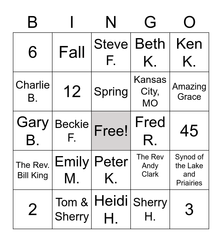 This bingo card has a free space and 44 words: 5, 3, 1, 2, 13, Sherry H., Steve F., Marilyn K., Ken K., Tom & Sherry, Beth K., Fred R., Peter K., Emily M., Sarah D., Heidi H., Jane K., Gary B., How Great Thou Art, Amazing Grace, Fall, Winter, Craig & Sherry, 6, Sept. 12, 1954, 45, 1956, Synod Executive, The Rev Andy Clark, The Rev. Bill King, John Knox, Synod of the Lake and Priairies, Louisville, KY, Silent Night, Beckie F., Jane B., Tom K., John Calvin, Spring, Charlie B., Kansas City, MO, Here I Am Lord, 12 and 1962.