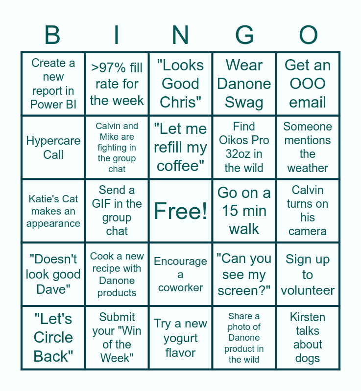 This bingo card has a free space and 34 words: "You're on Mute", Share a photo of Danone product in the wild, Someone is eating, Meet someone new at the office/virtually, "Doesn't look good Dave", Calvin and Mike are fighting in the group chat, Get an OOO email, "Let's Circle Back", >97% fill rate for the week, Post something on Workplace, "Let me refill my coffee", "Looks Good Chris", Try a new Danone product, KPIs are mentioned, Go on a 15 min walk, Someone mentions the weather, Submit your "Win of the Week", Katie's Cat makes an appearance, Cook a new recipe with Danone products, "Can you see my screen?", Encourage a coworker, "Are we all aligned?", Create a new report in Power BI, Calvin turns on his camera, Try a new yogurt flavor, Kirsten talks about dogs, Wear Danone Swag, Do something outdoors, Find Oikos Pro 32oz in the wild, Hypercare Call, Bring a new idea to the team, Send a GIF in the group chat, Sign up to volunteer and Send a pic of your pet(s)!.