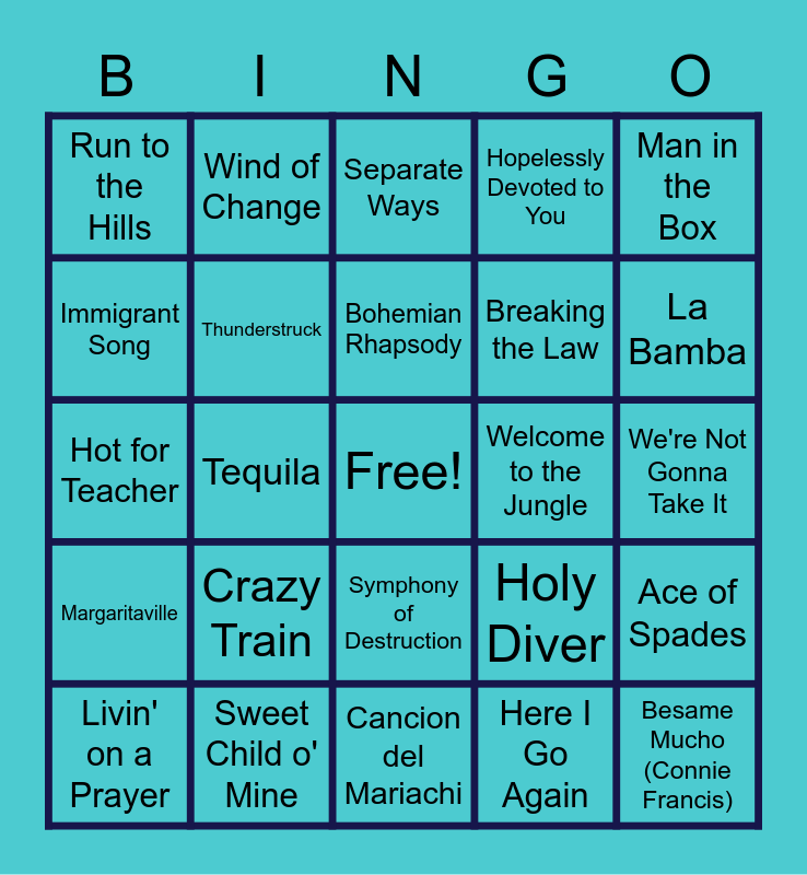 This bingo card has a free space and 24 words: Crazy Train, Sweet Child o' Mine, Bohemian Rhapsody, Livin' on a Prayer, Man in the Box, Run to the Hills, Immigrant Song, Wind of Change, Welcome to the Jungle, Symphony of Destruction, Breaking the Law, Hot for Teacher, Holy Diver, Ace of Spades, Thunderstruck, Here I Go Again, We're Not Gonna Take It, Separate Ways, La Bamba, Tequila, Besame Mucho (Connie Francis), Margaritaville, Hopelessly Devoted to You and Cancion del Mariachi.