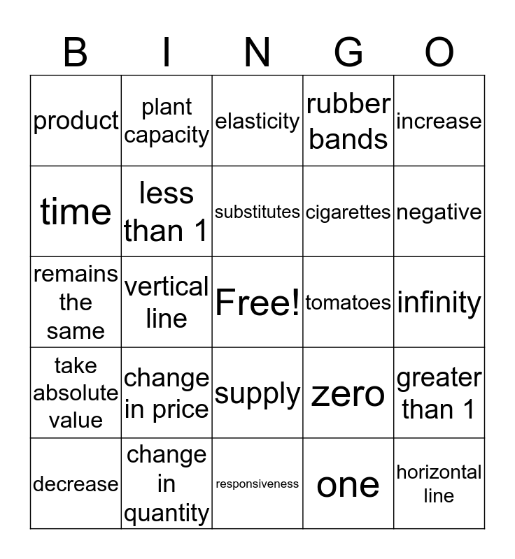 This bingo card has a free space and 24 words: change in price, change in quantity, substitutes, decrease, increase, product, time, plant capacity, tomatoes, supply, cigarettes, remains the same, zero, greater than 1, less than 1, one, infinity, elasticity, negative, vertical line, horizontal line, take absolute value, rubber bands and responsiveness.