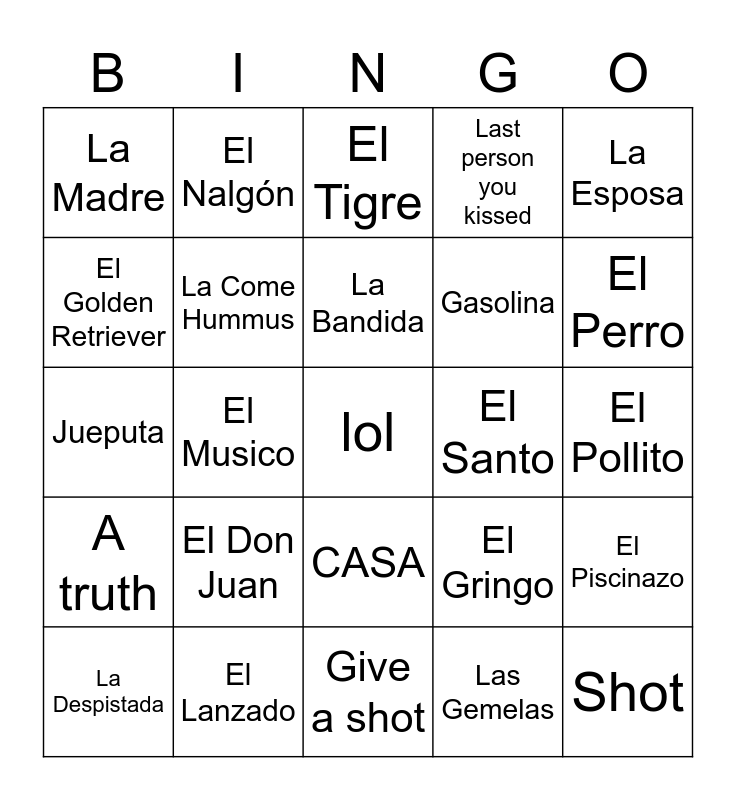 This bingo card has a free space and 24 words: El Don Juan, El Lanzado, La Bandida, La Despistada, La Esposa, La Madre, El Golden Retriever, El Nalgón, El Santo, CASA, Gasolina, Jueputa, El Gringo, El Piscinazo, La Come Hummus, Las Gemelas, El Pollito, El Tigre, El Perro, El Musico, Shot, A truth, Last person you kissed and Give a shot.