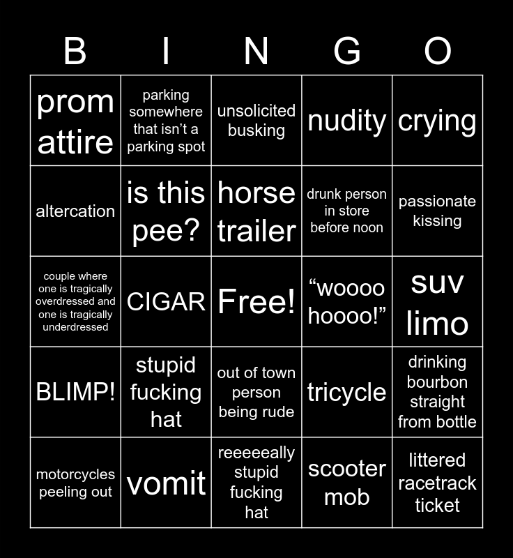 This bingo card has a free space and 24 words: stupid fucking hat, vomit, horse trailer, motorcycles peeling out, crying, prom attire, altercation, parking somewhere that isn’t a parking spot, “woooo hoooo!”, out of town person being rude, drunk person in store before noon, couple where one is tragically overdressed and one is tragically underdressed, tricycle, drinking bourbon straight from bottle, is this pee?, scooter mob, suv limo, unsolicited busking, passionate kissing, CIGAR, littered racetrack ticket, BLIMP!, nudity and reeeeeally stupid fucking hat.
