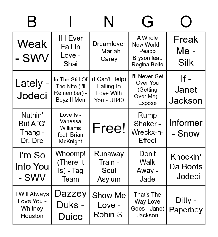 This bingo card has a free space and 24 words: I Will Always Love You - Whitney Houston, Whoomp! (There It Is) - Tag Team, (I Can't Help) Falling In Love With You - UB40, That's The Way Love Goes - Janet Jackson, Freak Me - Silk, Weak - SWV, If I Ever Fall In Love - Shai, Dreamlover - Mariah Carey, Rump Shaker - Wreckx-n-Effect, Informer - Snow, Nuthin' But A 'G' Thang - Dr. Dre, In The Still Of The Nite (I'll Remember) - Boyz II Men, Don't Walk Away - Jade, Knockin' Da Boots - Jodeci, Lately - Jodeci, Dazzey Duks - Duice, Show Me Love - Robin S., A Whole New World - Peabo Bryson feat. Regina Belle, If - Janet Jackson, I'm So Into You - SWV, Love Is - Vanessa Williams feat. Brian McKnight, Runaway Train - Soul Asylum, I'll Never Get Over You (Getting Over Me) - Expose and Ditty -Paperboy.