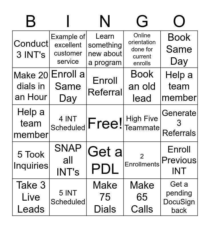 This bingo card has a free space and 24 words: SNAP all INT's, 5 INT Scheduled, Enroll Referral, Take 3 Live Leads, Book Same Day, Conduct 3 INT's, Make 20 dials in an Hour, Example of excellent customer service, High Five Teammate, Get a PDL, Book an old lead, Help a team member, 2 Enrollments, Enroll Previous INT, Enroll a Same Day, Make 65 Calls, Generate 3 Referrals, Learn something new about a program, Help a team member, 4 INT Scheduled, Get a pending DocuSign back, 5 Took Inquiries, Online orientation done for current enrolls and Make 75 Dials.