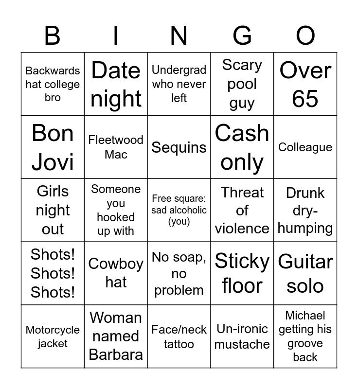 This bingo card has a free space and 24 words: Cowboy hat, Woman named Barbara, Sequins, Motorcycle jacket, Over 65, Backwards hat college bro, Bon Jovi, Date night, Threat of violence, No soap, no problem, Cash only, Girls night out, Sticky floor, Guitar solo, Fleetwood Mac, Un-ironic mustache, Drunk dry-humping, Undergrad who never left, Colleague, Someone you hooked up with, Michael getting his groove back, Shots! Shots! Shots!, Scary pool guy and Face/neck tattoo.