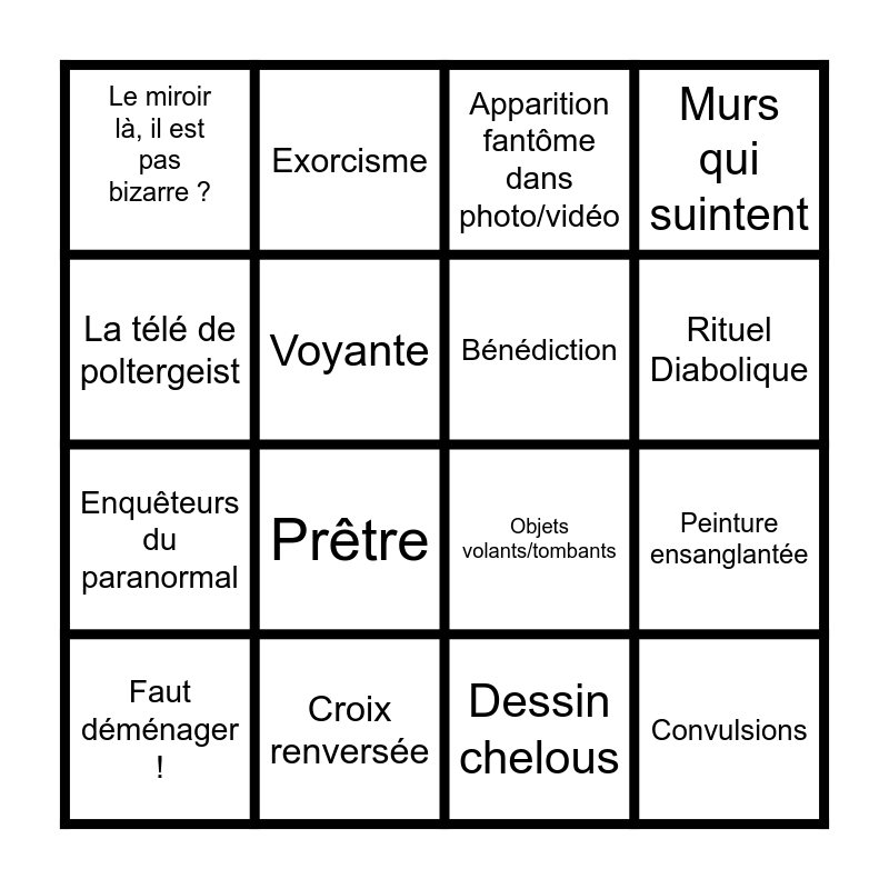 This bingo card has 16 words: Croix renversée, Peinture ensanglantée, Apparition fantôme dans photo/vidéo, Le miroir là, il est pas bizarre ?, Enquêteurs du paranormal, Exorcisme, Objets volants/tombants, Dessin chelous, La télé de poltergeist, Voyante, Faut déménager !, Murs qui suintent, Prêtre, Rituel Diabolique, Bénédiction and Convulsions.