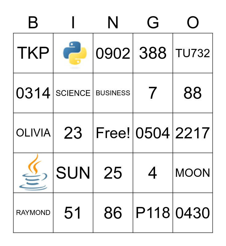 This bingo card has 2 images, a free space and 22 words: SUN, 51, BUSINESS, RAYMOND, TU732, TKP, 0314, 0504, 25, 7, OLIVIA, 4, MOON, SCIENCE, P118, 2217, 0902, 88, 23, 0430, 388 and 86.