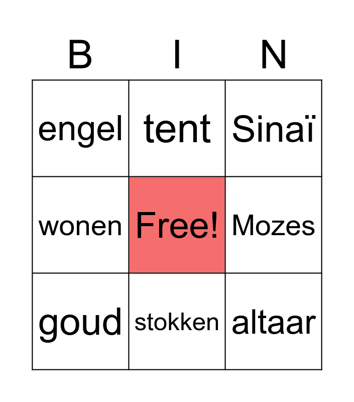This bingo card has a free space and 8 words: Mozes, Sinaï, tent, goud, engel, altaar, wonen and stokken.