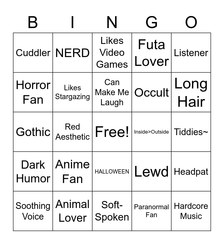 This bingo card has a free space and 24 words: Anime Fan, Animal Lover, Can Make Me Laugh, Soothing Voice, Listener, Cuddler, Horror Fan, NERD, Inside>Outside, HALLOWEEN, Occult, Gothic, Lewd, Headpat, Likes Stargazing, Paranormal Fan, Tiddies~, Likes Video Games, Long Hair, Red Aesthetic, Hardcore Music, Dark Humor, Futa Lover and Soft-Spoken.