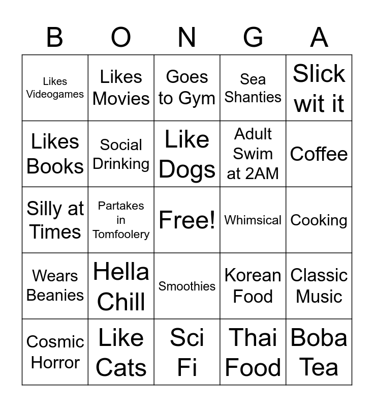 This bingo card has a free space and 24 words: Hella Chill, Like Cats, Like Dogs, Cosmic Horror, Slick wit it, Likes Videogames, Likes Books, Likes Movies, Whimsical, Smoothies, Adult Swim at 2AM, Silly at Times, Korean Food, Classic Music, Social Drinking, Thai Food, Cooking, Goes to Gym, Coffee, Partakes in Tomfoolery, Boba Tea, Wears Beanies, Sea Shanties and Sci Fi.