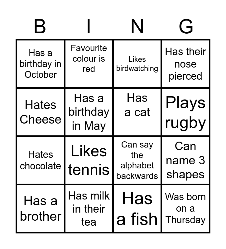 This bingo card has 84 words: Free!, Favourite colour is blue, Has a cat, Likes football, Can raise one eyebrow, Is left handed, Can speak Spanish, Loves Eurovision, Has sugar in their tea, Has seen a rat, Wears nail varnish, Has a bike, Hates chocolate, Has a tattoo, Is wearing a scarf, Has their nose pierced, Favourite colour is yellow, Favourite colour is red, Has a dog, Can waggle their ears, Favourite colour is green, Likes tennis, Has a fish, Has a sister, Has a brother, Is wearing blue socks, Is wearing a hat, Is wearing a coat, Is wearing trainers, Can whistle, Can roll their tongue, Can speak French, Hates football, Has milk in their tea, Has pierced ears, Has no piercings, Likes chocolate, Has a moustache, Can say the alphabet backwards, Can name 3 shapes, Has a driver’s license, Drove here today, Walked here today, Hates coffee, Owns rollerblades, Likes playing Scrabble, Likes birdwatching, Can name all the planets, Can sew a button on a shirt, Has a birthday in July, Was born on a Monday, Was born on a Thursday, Has a birthday in October, Has a birthday in January, Has a birthday in February, Has a birthday in September, Has a birthday this month, Has a birthday in May, Favourite number is 7, Plays rugby, Plays netball, Plays football, Has seen a fox, Ridden a horse, Favourite weather is rain, Loves Marmite, Hates Marmite, Loves Cheese, Hates Cheese, Has eaten fruit today, Has been on a boat, Has been on a plane, Speaks another language, Can cook a Sunday roast, Cooks Christmas Dinner, Still has chocolate left from Easter, Enjoys painting, Is a computer whiz, Has a blue front door, Has a green front door, Has a red front door, Has a bunny, Isn’t wearing socks and Is here with their family today.