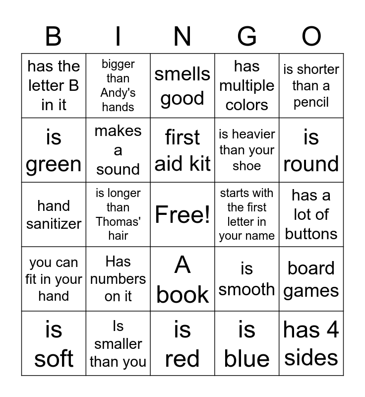 This bingo card has a free space and 24 words: Has numbers on it, Is smaller than you, first aid kit, is soft, is shorter than a pencil, has the letter B in it, is green, bigger than Andy's hands, starts with the first letter in your name, A book, is heavier than your shoe, hand sanitizer, is smooth, board games, makes a sound, is blue, has a lot of buttons, smells good, is round, is longer than Thomas' hair, has 4 sides, you can fit in your hand, has multiple colors and is red.