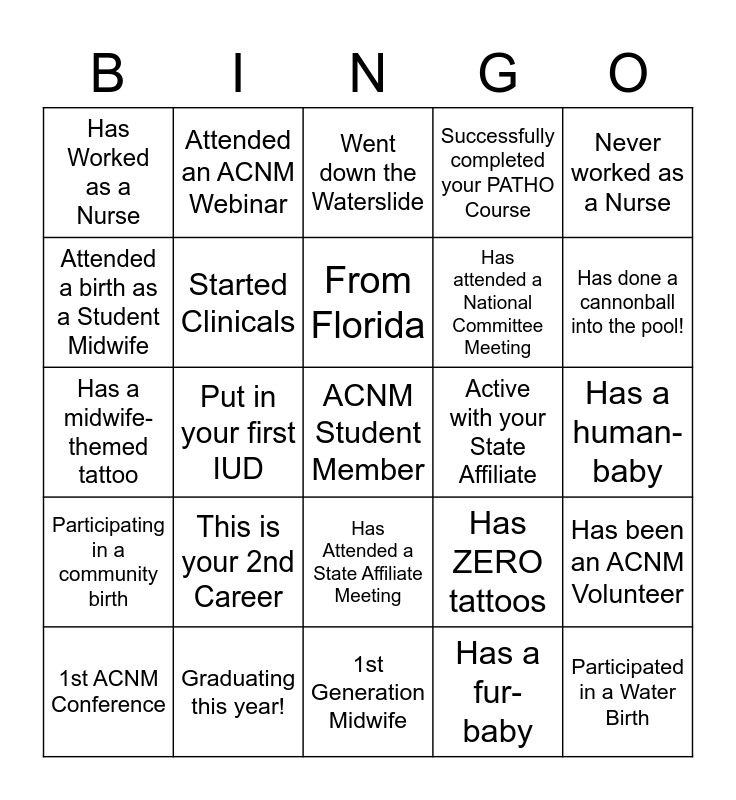 This bingo card has a free space and 24 words: This is your 2nd Career, Graduating this year!, From Florida, 1st ACNM Conference, Never worked as a Nurse, Has Worked as a Nurse, Attended a birth as a Student Midwife, Attended an ACNM Webinar, Active with your State Affiliate, Has Attended a State Affiliate Meeting, Has attended a National Committee Meeting, Has a midwife-themed tattoo, Has ZERO tattoos, Has been an ACNM Volunteer, Started Clinicals, Has a fur-baby, Has a human-baby, Went down the Waterslide, Has done a cannonball into the pool!, Put in your first IUD, Participated in a Water Birth, Participating in a community birth, Successfully completed your PATHO Course and 1st Generation Midwife.