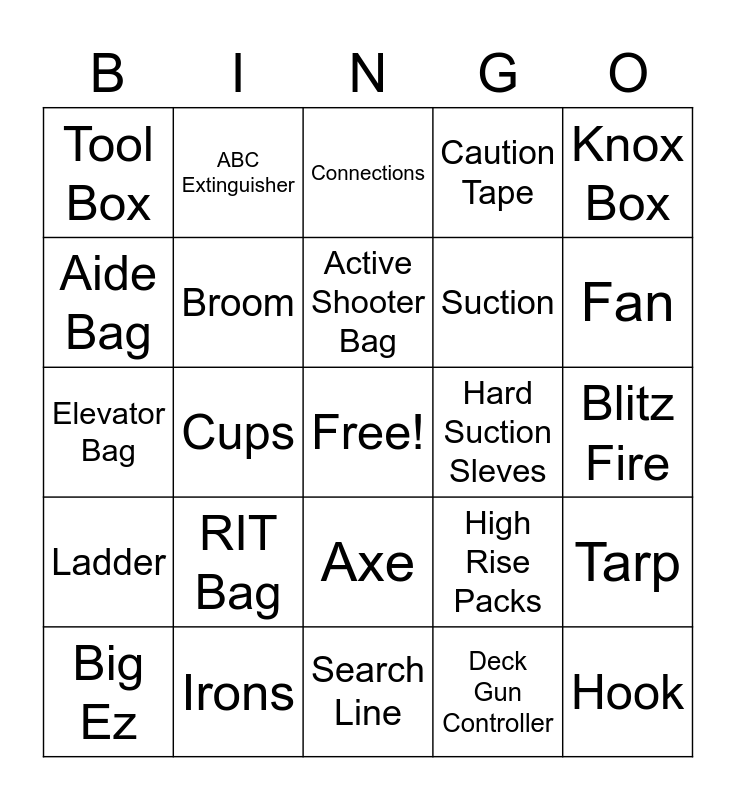 This bingo card has a free space and 43 words: Flares, Hook, Bolt Cutters, Big Ez, Salt, Deck Gun Controller, Connections, Hydrant Wrench, Knox Box, Irons, Caution Tape, Hard Suction Sleves, Axe, RIT Bag, Smoke Alarm Bag, Search Line, Rope Bag, Elevator Bag, Wheel Chocks, Fan, ABC Extinguisher, CO2 Extinguisher, Water Can, Tool Box, Electricity Tester, Blitz Fire, Siamese, Gated Y, High Rise Packs, Ladder, Absorbant, Tarp, Traffic Cones, Cups, Foam, Standpipe Bag, AED, Active Shooter Bag, Aide Bag, Suction, Triage Bag, Broom and Hydro Ram.