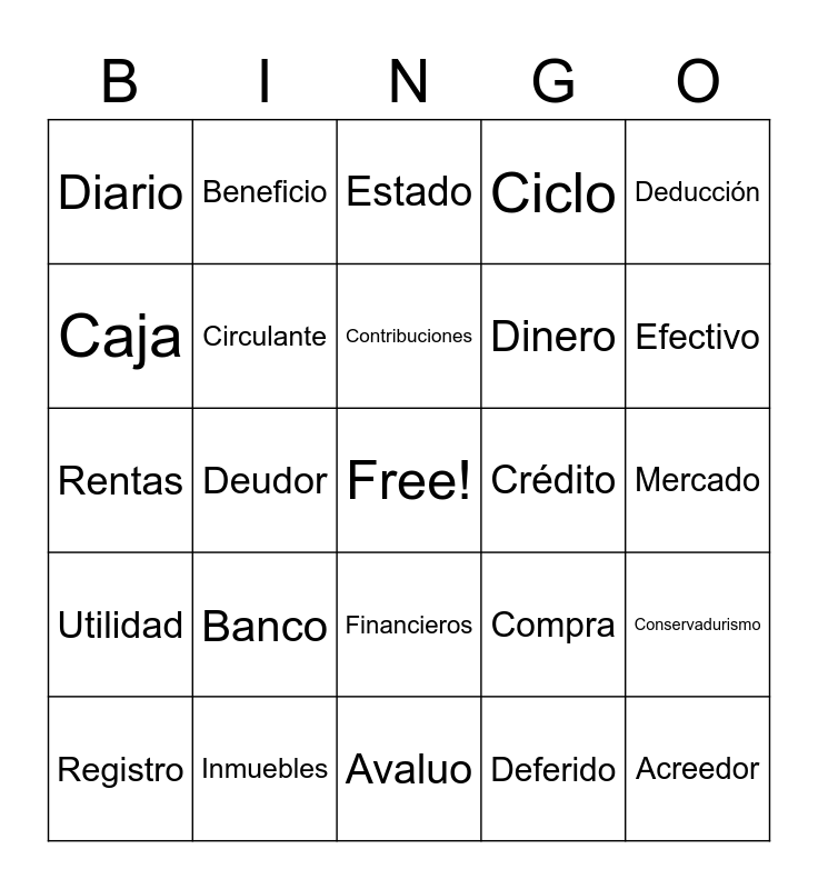 This bingo card has a free space and 50 words: Activo, Acreedor, Amortizacion, Avaluo, Banco, Balance, Beneficio, Bruto, Caja, Capital, Circulante, Ciclo, Conservadurismo, Compra, Conciliación, Contabilidad, Contribuciones, Crédito, Cuenta, Deducción, Deudor, Deferido, Diario, Dinero, Descuento, Depreciación, Efectivo, Egreso, Estado, Financieros, Gasto, Gastos, Hipoteca, Impuesto, Inmuebles, Inventario, Intangibles, Interés, IVA, Mercado, Operación, Pasivo, Patriomnio, Presupuesto, Registro, Rentas, Servicio, Tangible, Utilidad and Valor.