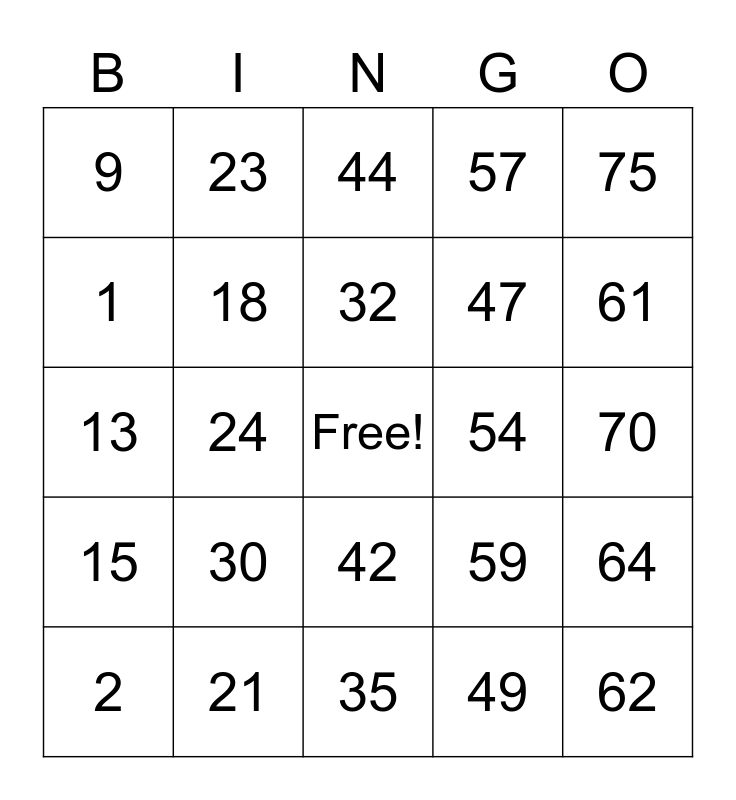 This bingo card has a free space and 24 words: 2, 30, 32, 49, 75, 9, 23, 44, 54, 70, 13, 18, 59, 64, 1, 21, 35, 57, 61, 15, 24, 42, 47 and 62.