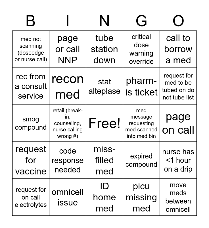 This bingo card has a free space and 42 words: compatibility question, stat alteplase, temperature/pressure alarm, code response needed, picu missing med, nurse has <1 hour on a drip, move meds between omnicell, med request for order put in <10 min ago, tube station down, miss-filled med, page on call, request for med to be tubed on do not tube list, retail (break-in, counseling, nurse calling wrong #), call to borrow a med, med message requesting drug in omnicell, expired compound, expired med, smog compound, premix station with >5 to prep, page or call NNP, rec from a consult service, med sent secure returns in tube, omnicell discrepancy, med not scanning (doseedge or nurse call), trauma B/stab code/OB c-section, new DKA needs bags, pharm-is ticket, doseedge bypass, new LOS/EOS orders, call from outside pharm to borrow med, tube shut down for full tube, request for vaccine, recon med, ID home med, status board clear, request for on call electrolytes, omnicell issue, med message requesting med scanned into med bin, albuterol syringe, phone call from MD needing dose recommendation, critical dose warning override and need to make dilution narc.