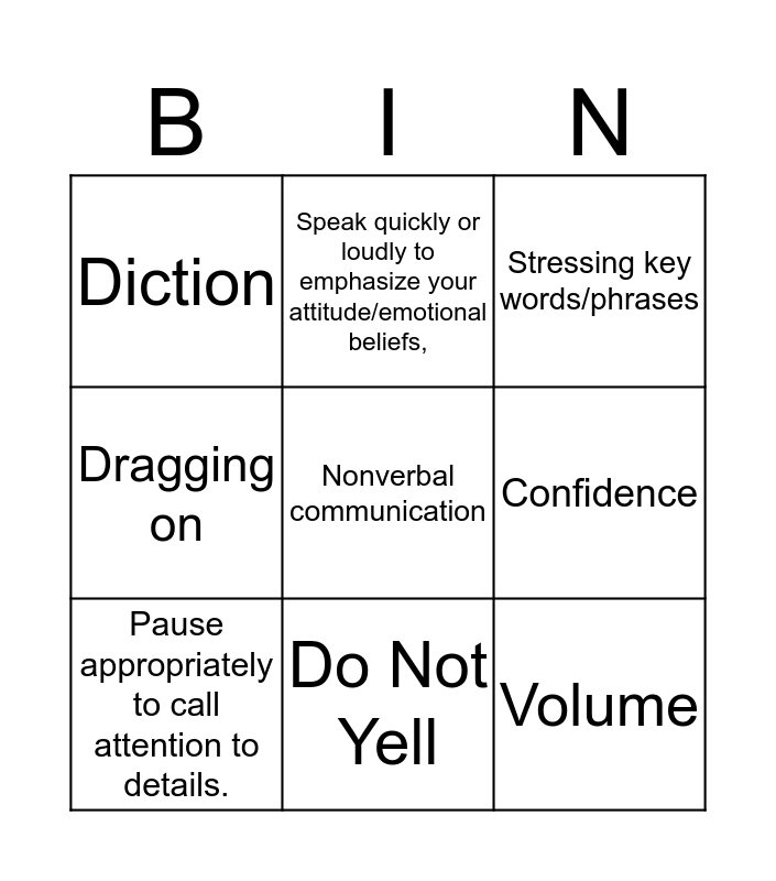 This bingo card has a free space and 8 words: Confidence, Stressing key words/phrases, Speak quickly or loudly to emphasize your attitude/emotional beliefs,, Pause appropriately to call attention to details., Diction, Volume, Dragging on and Do Not Yell.