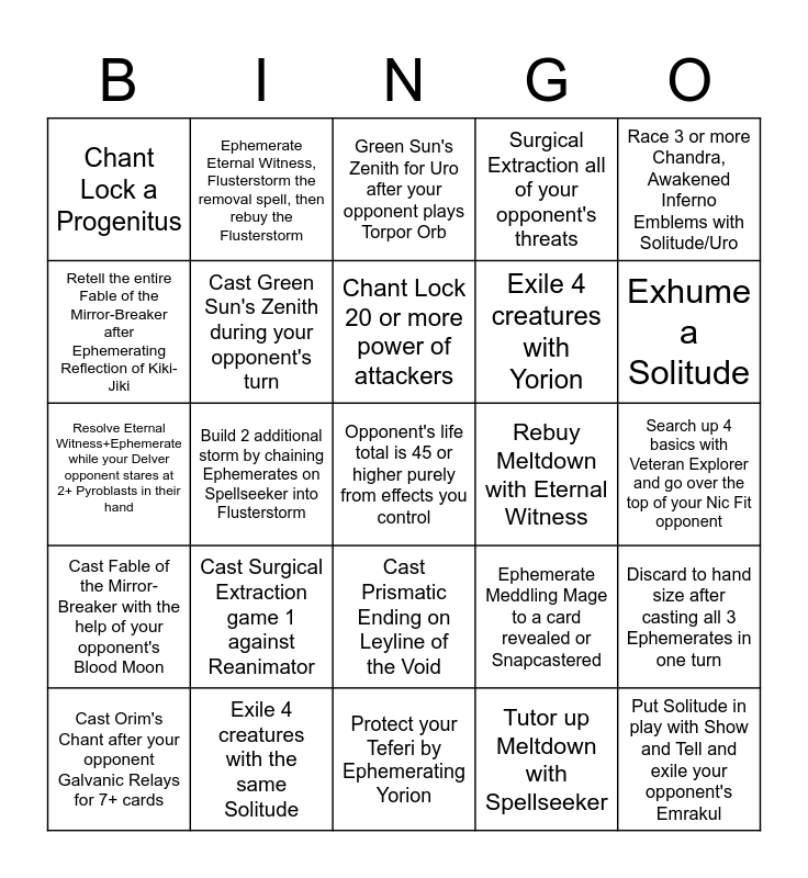 This bingo card has a free space and 24 words: Cast Surgical Extraction game 1 against Reanimator, Exile 4 creatures with the same Solitude, Chant Lock 20 or more power of attackers, Cast Orim's Chant after your opponent Galvanic Relays for 7+ cards, Race 3 or more Chandra, Awakened Inferno Emblems with Solitude/Uro, Chant Lock a Progenitus, Retell the entire Fable of the Mirror-Breaker after Ephemerating Reflection of Kiki-Jiki, Ephemerate Eternal Witness, Flusterstorm the removal spell, then rebuy the Flusterstorm, Rebuy Meltdown with Eternal Witness, Cast Prismatic Ending on Leyline of the Void, Exile 4 creatures with Yorion, Resolve Eternal Witness+Ephemerate while your Delver opponent stares at 2+ Pyroblasts in their hand, Ephemerate Meddling Mage to a card revealed or Snapcastered, Discard to hand size after casting all 3 Ephemerates in one turn, Cast Green Sun's Zenith during your opponent's turn, Tutor up Meltdown with Spellseeker, Search up 4 basics with Veteran Explorer and go over the top of your Nic Fit opponent, Green Sun's Zenith for Uro after your opponent plays Torpor Orb, Exhume a Solitude, Build 2 additional storm by chaining Ephemerates on Spellseeker into Flusterstorm, Put Solitude in play with Show and Tell and exile your opponent's Emrakul, Cast Fable of the Mirror-Breaker with the help of your opponent's Blood Moon, Surgical Extraction all of your opponent's threats and Protect your Teferi by Ephemerating Yorion.
