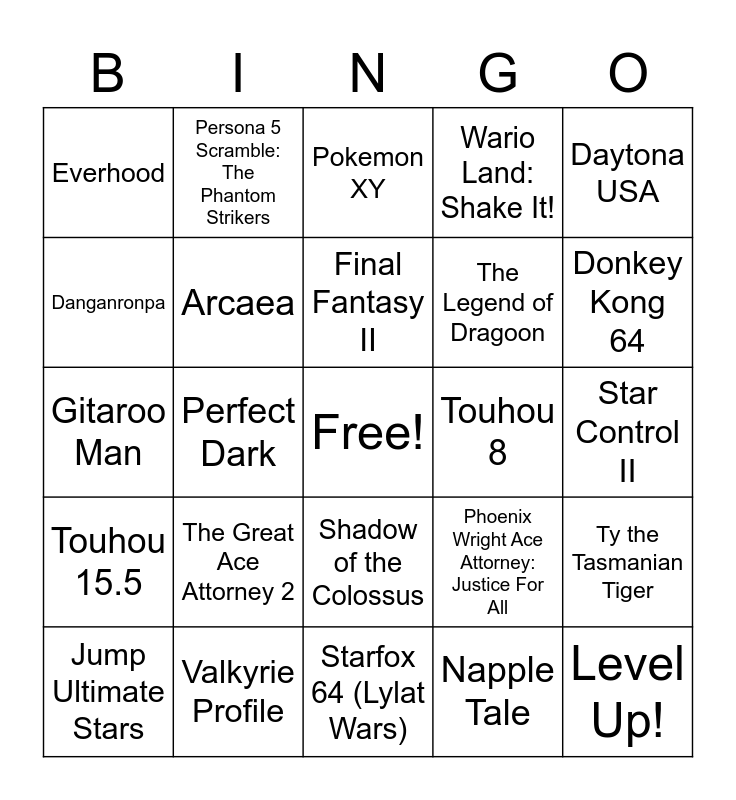 This bingo card has a free space and 722 words: Earthbound, Undertale, Final Fantasy VII, Pokemon XY, Final Fantasy VIII, Kingdom Hearts, Persona 4, Pokemon Black/White, Chrono Trigger, Super Smash Bros Melee, Final Fantasy VI, Final Fantasy X, Super Mario Galaxy 2, Super Mario Galaxy, Skies of Arcadia, Chrono Cross, Super Smash Bros Brawl, Pokemon Diamond/Pearl, Sonic Adventure, The Legend of Zelda: Majora's Mask, Cuphead, Sonic Adventure 2, The Legend of Zelda: Twilight Princess, A Hat in Time, MOTHER 3, Pokemon Red/Blue, Pokemon Ruby/Sapphire, The Legend of Zelda: Wind Waker, Crypt of the Necrodancer, Final Fantasy X-2, Donkey Kong Country 2, Kirby Air Ride, Paper Mario The Thousand Year Door, Xenoblade Chronicles 2, Pokemon Gold/Silver, Catherine, Donkey Kong 64, Super Mario RPG, Phoenix Wright Ace Attorney: Justice For All, Final Fantasy IV, Phoenix Wright: Ace Attorney, Hotline Miami 2, Super Mario Odyssey, Guilty Gear XX, Final Fantasy XIII, Yoshi's Woolly World, Cave Story, Xenogears, Kirby 64, Castlevania Symphony of the Night, Jet Set Radio, Donkey Kong Country 3, Sonic the Hedgehog 3, Persona 3, F-Zero GX, The World Ends With You, Sonic Mania, Golden Sun, Kingdom Hearts 2, Apollo Justice: Ace Attorney, Banjo Kazooie, Mischief Makers, Paper Mario, Starfox 64 (Lylat Wars), Xenoblade Chronicles, Celeste, The Great Ace Attorney, Mother, Danganronpa, Professor Layton vs Phoenix Wright, Perfect Dark, Goldeneye 007, Diddy Kong Racing, Guilty Gear Xrd, Crash Bandicoot, Final Fantasy V, Soul Calibur 2, Donkey Kong Country Tropical Freeze, Super Smash Bros, Nier Automata, Metroid Prime, Mario Party, Bayonetta, Bully, Donkey Kong Country, Ace Attorney Investigations 2, Phoenix Wright Ace Attorney: Trials and Tribulations, Kirby Super Star Ultra, Star Fox, Anarchy Reigns, BlazBlue Calamity Trigger, Shovel Knight, Megaman X, Super Meat Boy, Scott Pilgrim Vs. The World - The Game, Okami, Megaman 8, Super Smash Bros Wii U, Hotline Miami, Street Fighter 2, Castlevania III: Dracula's Curse, Sonic the Hedgehog 2, Rhythm Heaven Fever, Ar Tonelico 2, Bastion, Banjo Tooie, Animal Crossing, Kid Icarus Uprising, Tales of Symphonia, Megaman 10, Mystical Ninja Starring Goemon, Plok, Xenoblade Chronicles X, Adventure Time: Hey Ice King! Why'd You Steal Our Garbage?!!, Shadow of the Colossus, Terranigma, Super Mario World, Pokemon Stadium, Megaman 9, Super Mario Sunshine, Crash Bandicoot 2, Persona 4 Ultimax, Touhou 10, Octopath Traveler, Golden Sun: Lost Age, Marvel vs Capcom, Mario Kart 8, Castle Crashers, Megaman 4, Katamari Damacy, Nuclear Throne, Persona 5, Tekken 7, Risk of Rain, Mario Kart 64, Super Metroid, DuckTales, Pokemon Trading Card Game, Dark Souls, Megaman 3, Final Fantasy Crystal Chronicles, The Sims, Grandia 2, No More Heroes, Dustforce, Megaman 7, Lemmings, The Elder Scrolls V: Skyrim, The Legend of Zelda: Breath of the Wild, Deadbolt, Miitopia, Secret of Mana, Megaman 5, Jet Force Gemini, Rivals of Aether, Super Mario World 2: Yoshi's Island, Sonic '06, Super Mario 64, Deltarune, Risk of Rain 2, Shantae and the Pirate's Curse, Sonic Heroes, Guilty Gear Strive, Umineko Questions, Sonic and the Secret Rings, Hypnospace Outlaw, Touhou 17, Starcraft, Kirby's Adventure, Skullgirls, Mario Kart Super Circuit, Blue Reflection, Final Fantasy XV, Ys Origin, OutRun 2006, The Legend of Zelda: Minish Cap, Opoona, Final Fantasy Tactics Advance, Crash Bandicoot 3, Kirby's Dream Course, Super Mario 3D World, Danganronpa 2, Transistor, Tetris & Dr. Mario, Mario Kart Double Dash, Star Control II, Killer7, Plants vs Zombies, R4 Ridge Racer Type 4, Nights into Dreams, Gitaroo Man, The Legend of Zelda: A Link to the Past, Super Mario Bros 3, Street Fighter IV, Bomberman 64, Digimon World 3, Gravity Rush, World of Goo, Tekken 3, Splatoon 2, World of Warcraft, Mario Party 2, Touhou 3, Megaman 2, Sonic CD, Metal Gear Solid 3, Fire Emblem: Path of Radiance, The Legend of Zelda: Skyward Sword, Hotel Dusk: Room 215, Actraiser, Sonic Unleashed, Lethal League Blaze, Donkey Kong Country Returns, Civilization VI, Outer Wilds, Mario & Luigi Dream Team, Shenmue, The Legend of Dragoon, Bloodborne, Dark Cloud, Megaman 6, Mighty Switch Force! 2, Monster Hunter World, 1080 Snowboarding, Streets of Rage, Trials of Mana, Dead Rising, F-Zero, Mario Tennis, Pokemon Sun/Moon, Mass Effect, Capcom vs SNK 2, Stardew Valley, Battletoads, Pokemon Snap, Hollow Knight, Night in the Woods, FEZ, Sonic Colors, Pokemon Mystery Dungeon: Explorers of Sky, Team Fortress 2, Pokemon Sword Shield, NEO: The World Ends With You, Jazz Jackrabbit 2, Bravely Default: Flying Fairy, NieR, Kurushi (Intelligent Qube) Final, At Least There Is Ceda Cedovic, Fantastic Four, Age of Empires (Rise of Rome), Marvel vs Capcom 3, The Legend of Zelda: Ocarina of Time, VVVVVV, Lufia 2, Donkey Kong Land, Final Fantasy III, Bubsy, Mad Rat Dead, Streets of Sim City, Killer Instinct, Final Fantasy Tactics Advance 2, Super Castlevania IV, Diablo 2, Final Fantasy, Age of Empires II (Age of Conquerors), Conker's Bad Fur Day, Final Fantasy XIII-2, Wild Arms 5, Spyro the Dragon, Pilot Wings 64, The 7th Guest, OFF, Mario Kart Wii, Bomberman Hero, We Love Katamari, Mega Man Star Force 3, Ruiner, Pokemon Black White 2, WarioWare Gold, Fire Emblem: Awakening, Doom 2016, Portal 2, Gurumin: A Monstrous Adventure, Wild Arms 3, Final Fantasy XI, Blue Dragon, Neon Genesis Evangelion (N64), Parappa the Rapper, Animal Crossing: Wild World, ICO, Bejeweled 2, Marvel vs Capcom 2, Pokemon Colosseum, Splinter Cell: Chaos Theory, Bloodstained: Ritual of the Night, Snowboard Kids, Yu Gi Oh World Wide Edition, Castlevania Dracula X, Super Mario Kart, Kirby's Dream Land 3, Fall Guys, Touhou 12, Tunic, Space Channel 5 Part 2, Soul Blazer, Final Fantasy VII: Remake, God Hand, Animal Crossing: New Leaf, Maui Mallard in Cold Shadow, Touhou 8, F-Zero X, VA-11 HALL-A, Atelier Shallie: Alchemists of the Dusk Sea, LISA: The Painful, The Legend of Zelda: Link's Awakening, Fire Emblem: Sacred Stones