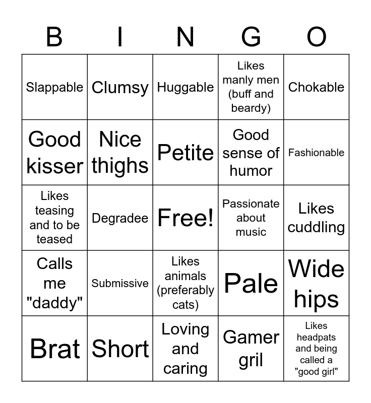 This bingo card has a free space and 24 words: Submissive, Short, Petite, Brat, Chokable, Slappable, Good kisser, Clumsy, Passionate about music, Likes animals (preferably cats), Good sense of humor, Likes teasing and to be teased, Pale, Wide hips, Nice thighs, Gamer gril, Likes cuddling, Huggable, Fashionable, Degradee, Likes headpats and being called a "good girl", Calls me "daddy", Likes manly men (buff and beardy) and Loving and caring.
