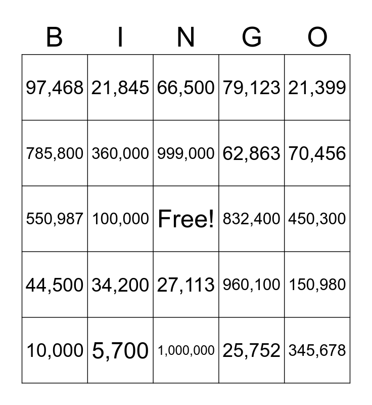 This bingo card has a free space and 24 words: 34,200, 5,700, 999,000, 10,000, 21,399, 97,468, 785,800, 21,845, 832,400, 27,113, 62,863, 550,987, 960,100, 150,980, 360,000, 25,752, 450,300, 66,500, 70,456, 100,000, 345,678, 44,500, 79,123 and 1,000,000.