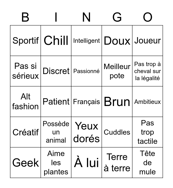 This bingo card has a free space and 24 words: Possède un animal, Aime les plantes, Passionné, Geek, Joueur, Sportif, Pas si sérieux, Chill, Brun, Yeux dorés, Meilleur pote, Alt fashion, Cuddles, Pas trop tactile, Discret, Terre à terre, Ambitieux, Intelligent, Pas trop à cheval sur la légalité, Patient, Tête de mule, Créatif, Doux and À lui.