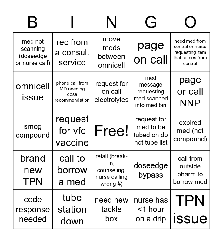 This bingo card has a free space and 43 words: compatibility question, TPN issue, stat alteplase, code response needed, picu missing med, nurse has <1 hour on a drip, move meds between omnicell, med request for order put in <10 min ago, need med from central or nurse requesting item that comes from central, tube station down, page on call, request for med to be tubed on do not tube list, retail (break-in, counseling, nurse calling wrong #), call to borrow a med, med message requesting drug in omnicell, need new tackle box, expired compound, smog compound, premix station with >5 to prep, page or call NNP, rec from a consult service, med sent secure returns in tube, omnicell discrepancy, med not scanning (doseedge or nurse call), trauma B/stab code/OB c-section, expired med (not compound), new DKA needs bags, pharm-is ticket, doseedge bypass, brand new TPN, new LOS/EOS orders, call from outside pharm to borrow med, tube shut down for full tube, request for vfc vaccine, recon med, ID home med, status board clear, request for on call electrolytes, omnicell issue, med message requesting med scanned into med bin, emergent arrival page, phone call from MD needing dose recommendation and critical dose warning override.