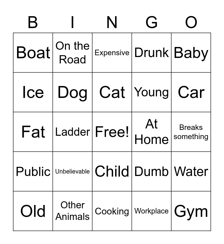 This bingo card has a free space and 24 words: Unbelievable, Other Animals, Cat, Old, Baby, Boat, Ice, On the Road, At Home, Child, Young, Fat, Dumb, Water, Dog, Workplace, Breaks something, Expensive, Car, Ladder, Gym, Public, Drunk and Cooking.